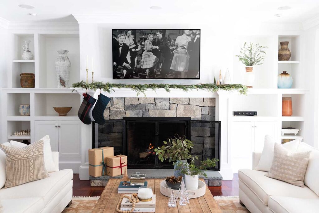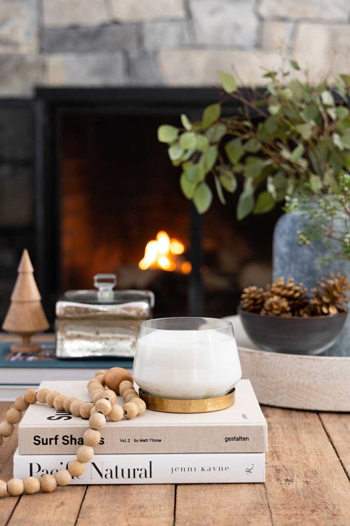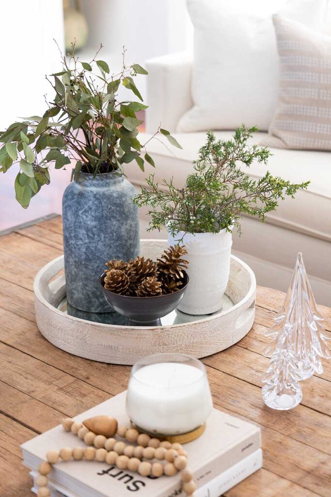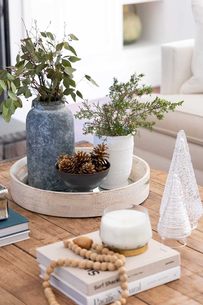 Coffee tables can be a fun opportunity to showcase holiday décor. Bring in natural elements such as layers of greens as well as mixed materials like wood, glass, and ceramics. Create height by stacking books or using a tray to hold everything. Try not to clutter your space, and instead aim to have a balance of holiday items and neutral staples to create a cohesive arrangement.