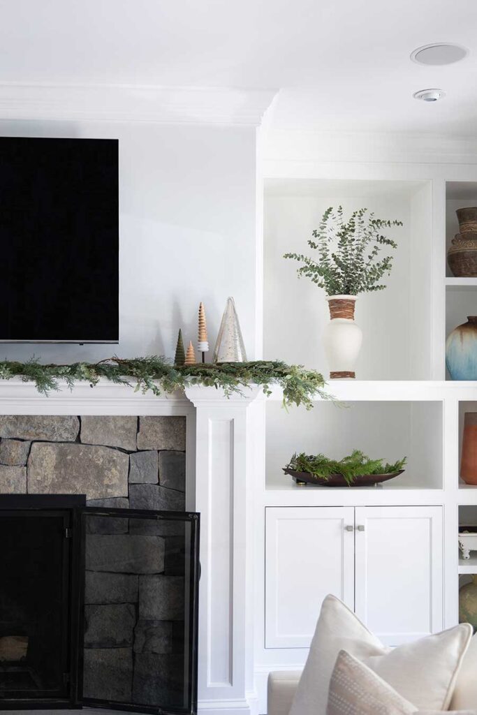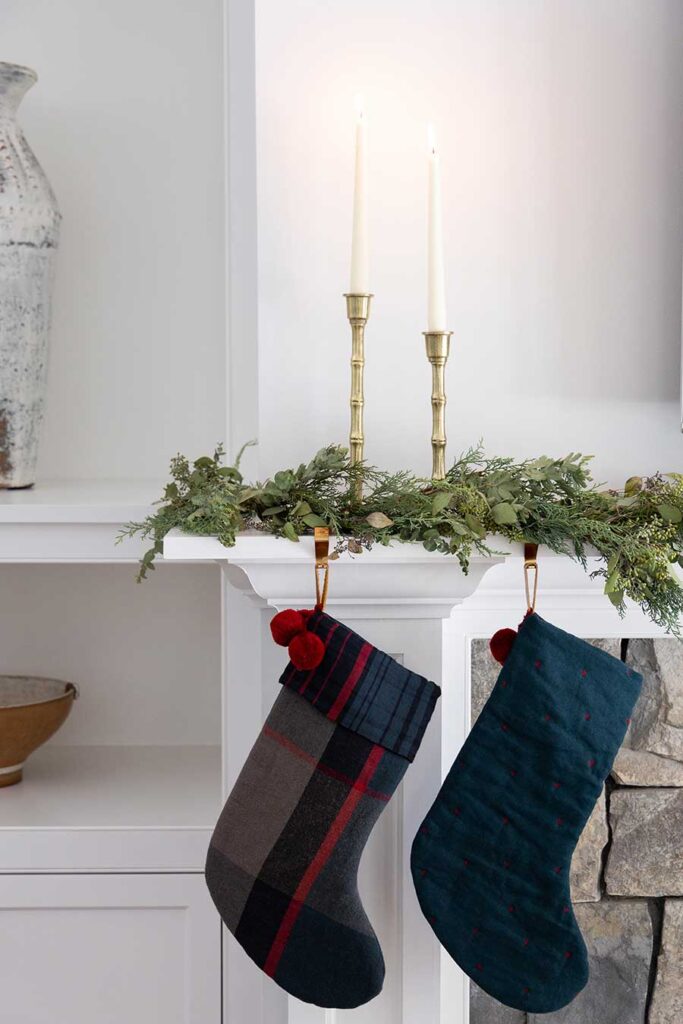 The mantle is a grounding space within a room. With a simple approach, the green garland adds the perfect amount of detail without being cluttered and the asymmetrical positioning of the stockings simplifies the scene without losing tradition. To balance out the design, we paired wooden, handmade trees with textured brass candlesticks.