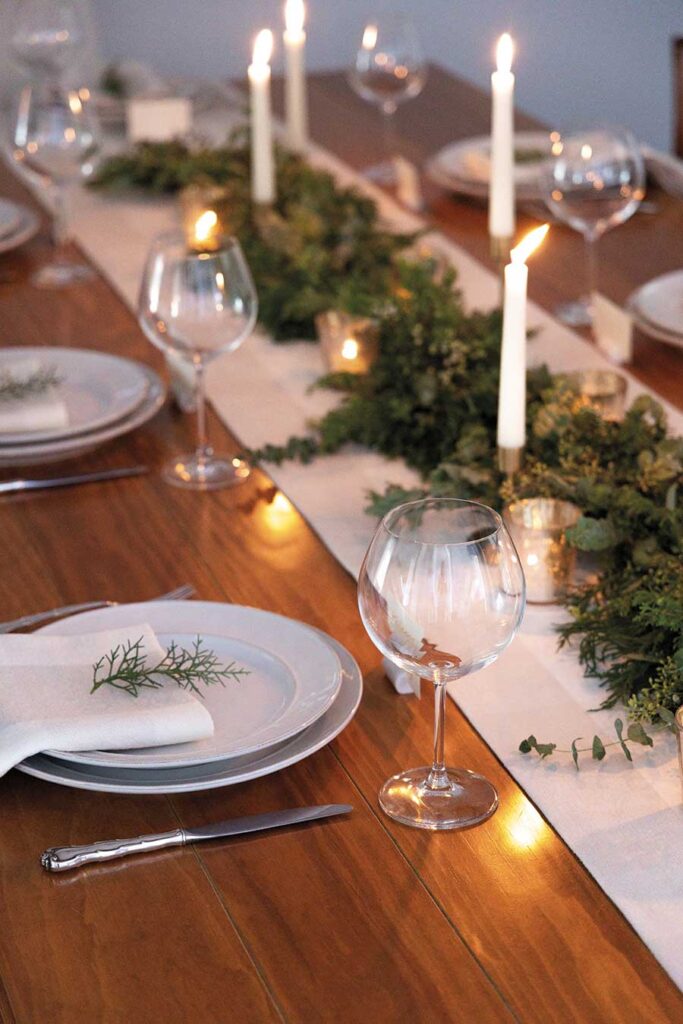 I love adding a lot of layers. Candles of different heights make the table feel elevated and intimate. Also, greenery is always a must for me when designing a tablescape; it brings an element of life and a pop of color without it being over the top.