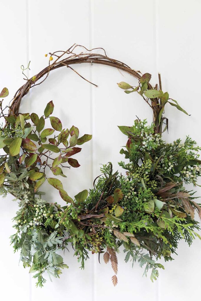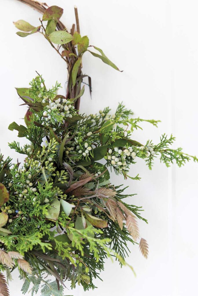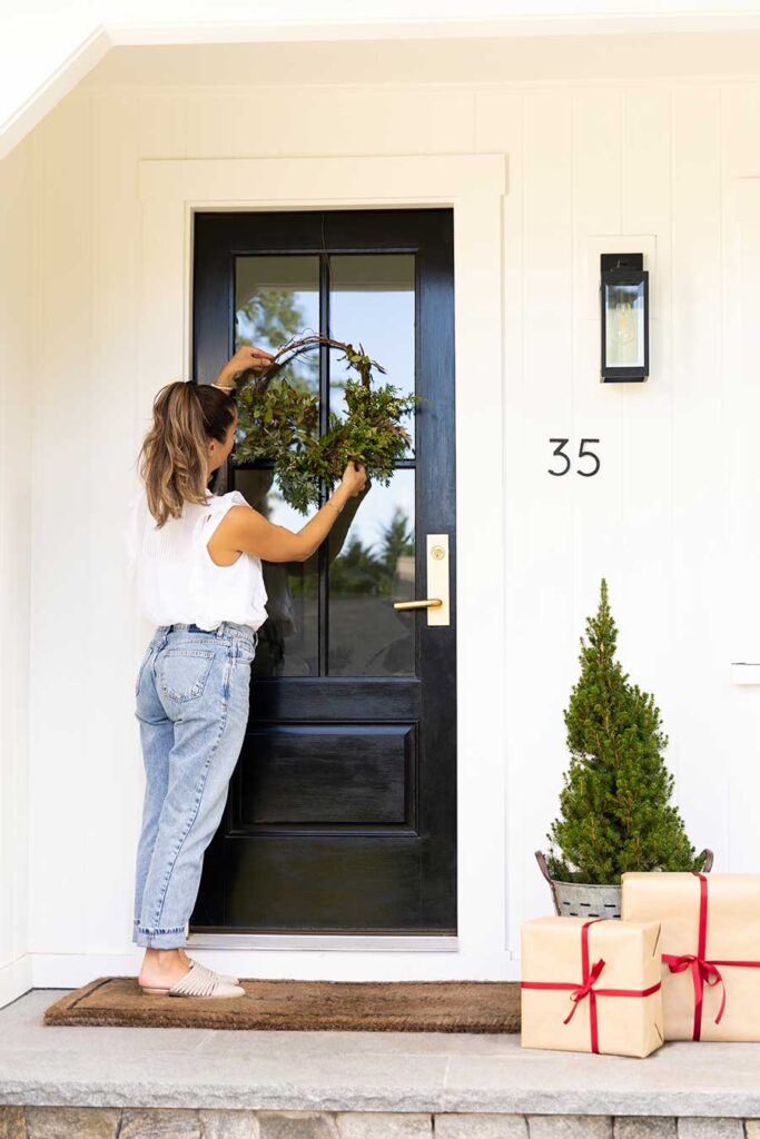 When designing a front door, I like to create an entrance that will last for the entire winter. Here we added a wreath with winter greens and berries. I love grounding the front door with an oversized doormat that can be layered with an indoor/outdoor rug. By incorporating a planter with a tree, we added elevation to the front entrance, which is warm and welcoming to guests.