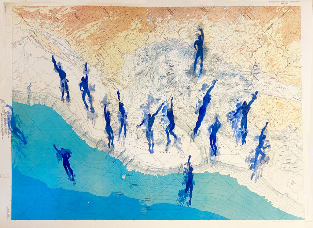 The artist’s layered compositions combine mapping, text, and painting in thought-provoking ways. Executed on stretched canvas, wood panels, and vintage charts, his poignant compositions explore topics of nature, the environment, and the role of humans—both in the natural world and as part of organized societies.